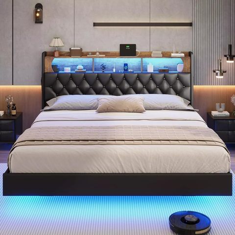 Moderna struttura del letto galleggiante a due dimensioni con luci a LED in pelle sintetica testiera rivestita intelligente letto nascosto supporto stoccaggio nero